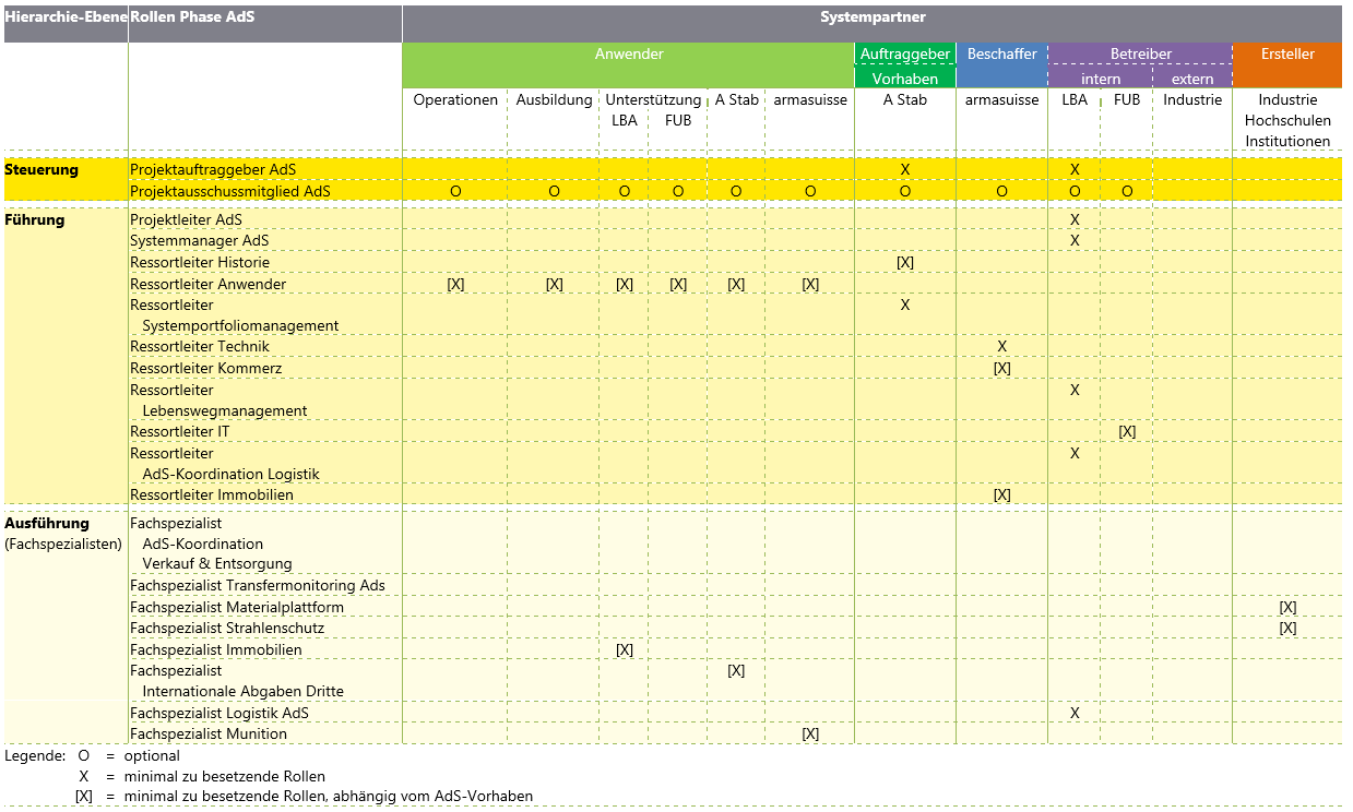 Die Tabelle 10 gibt eine Übersicht der Rollen in der Projektorganisation. Sie zeigt zudem die Zuordnung der Rolle zur Hierarchieebene und zum Partner. Weiter weist sie die in einer Projektorganisation minimal zu besetzende Rollen aus oder ob der Projektauftraggeber AdS bzw. Projektleiter AdS eine Rolle optional besetzen können. Sind im Ausserdienststellungsvorhaben z.B. Immobilien betroffen oder werden Verträge erstellt, so müssen zwingend die dafür vorgesehenen, mit [X] bezeichneten Rollen eingesetzt werden ([X] = minimal zu besetzende Rollen, abhängig von Projektkategorie oder der Beschaffung).